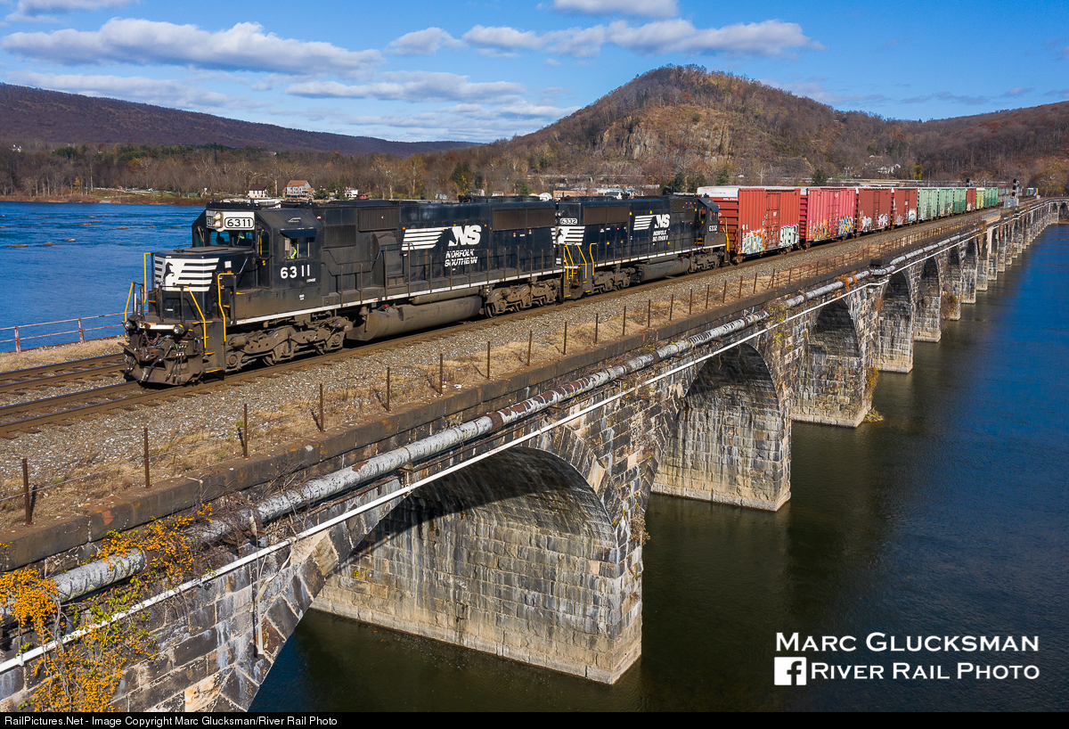 Switching Ends. Norfolk Southern 6311 and 6332 (SD40E) lead train H53 as it make the trip to Enola, PA over the Susquehanna River on the Rockville Bridge on November 18, 2020. With the introduction of the SD70ACus to the helper fleet in Altoona, PA, these standard cabs have been released to other local assignments across the system, regularly seeing the front of the train for the first time in many years. The Rockville Bridge was completed in 1902 and remains the longest stone masonry arch railroad viaduct in the world.