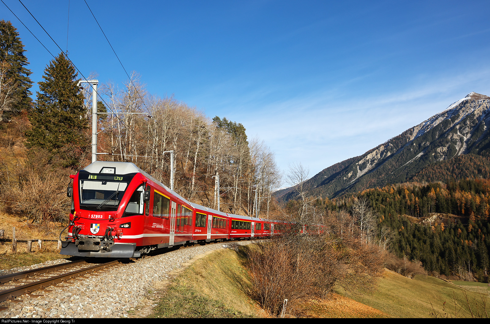 | Interregio 1148 of the Rhaetian Railway from St.Moritz to Chur, on the Albula line between Filisur and Alvaneu. Leading is first class cab car At # 57803, followed by the permanently coupled 6-car ALVRA trainset, shoved by Ge 4/4 III # 643 (not visible). On the right is Muchetta mountain above Filisur. |