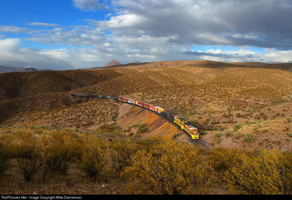 After a rainy and cold day in the high desert country of Arizona, the sun breaks out briefly late in the afternoon, illuminating the scene in golden light, as the Arizona Eastern Railway South Siding to Clifton train works upgrade toward Tunnel 6 south of Clifton on October 26, 2020. The job is doubling the hill because of heavy tonnage and wet rails, and is making its third trip up to the top of the grade at South Siding, including a morning run to Clifton to pick up cars left by Freeport McMoRan’s industrial railroad over the weekend.