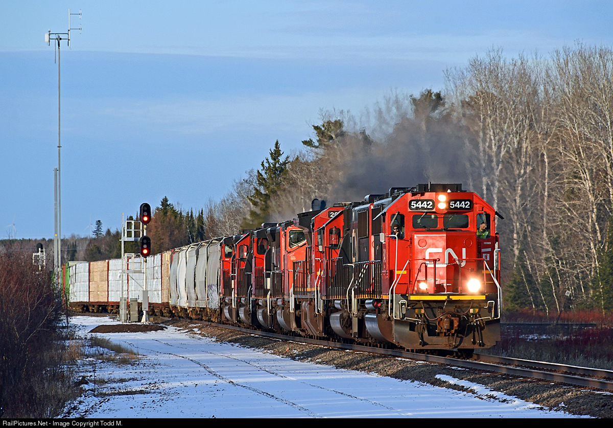 | After coming up from Proctor to drop cars off at Keenan yard, CN 5442 dodges long late afternoon shadows as they head back to Proctor with 7 engines total and 49 cars trailing. |