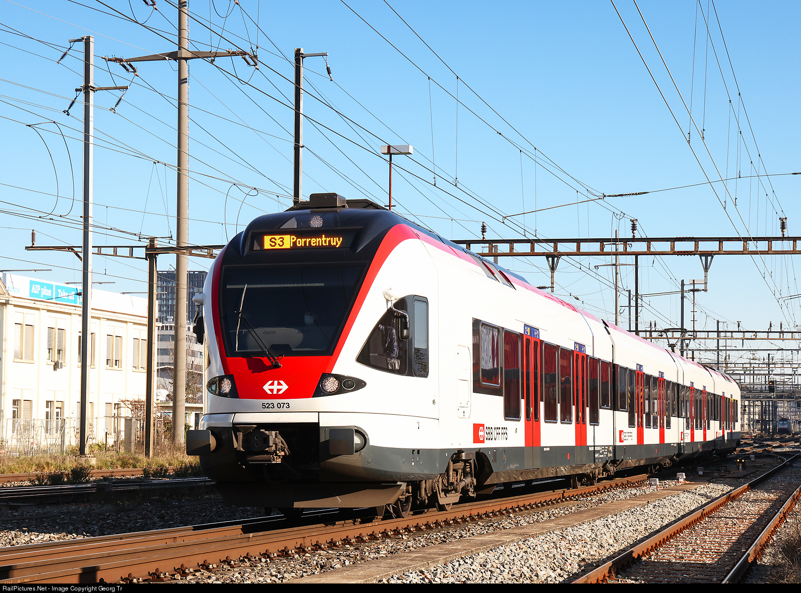 | "Flirt" regional train RABe 523 # 073 is running the S 3 service 17346 from Olten via Liestal-Basel-Laufen-Delémont to Porrentruy, leaving Pratteln. |