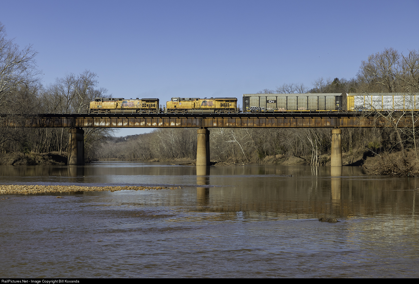 A westbound manifest on the UP Jefferson City Sub crosses the Meramec River at Sherman, Missouri. The Meramec River dumps into the Mississippi River about 20 miles downstream from this location.