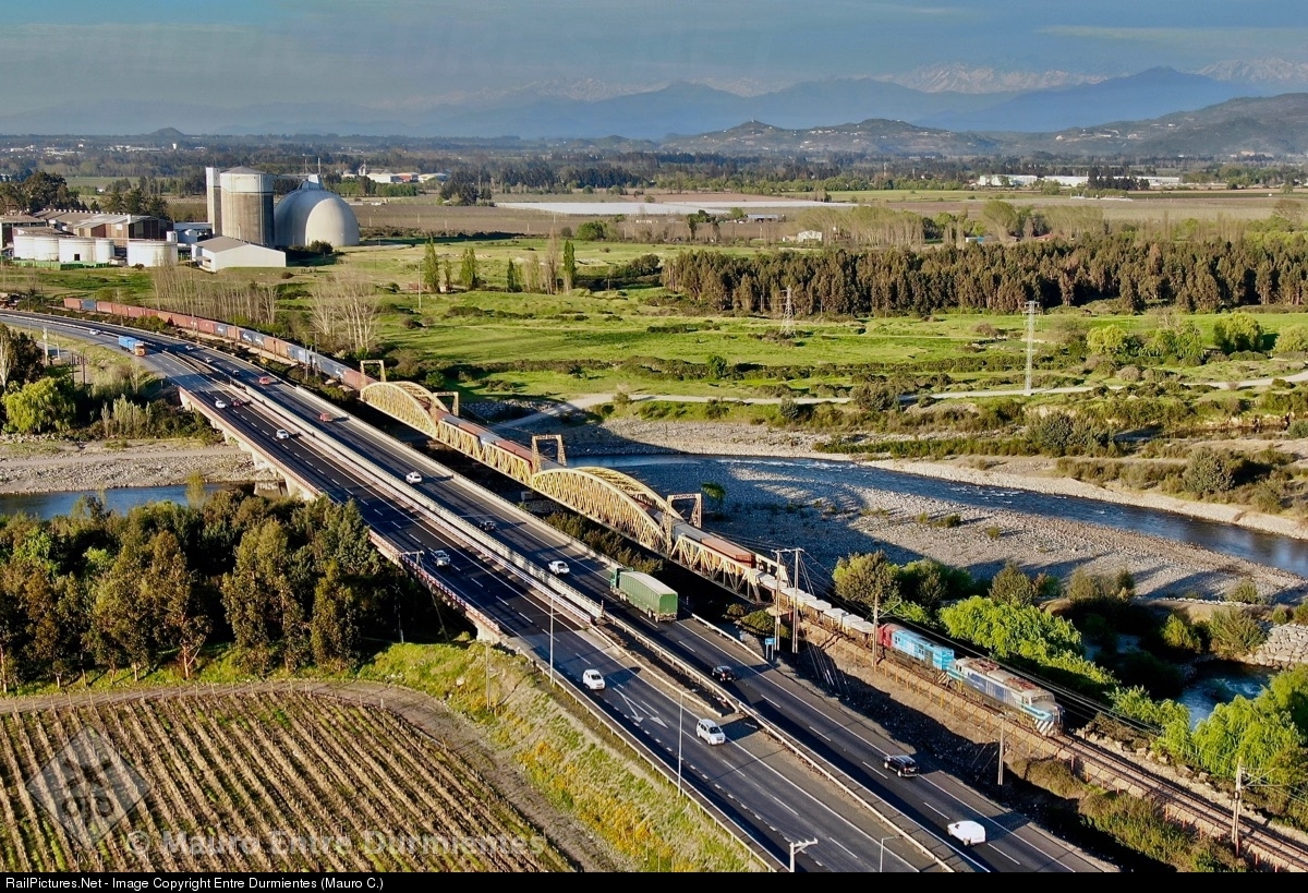 | E-32 electric locomotive built in 1961-1962 by Breda Marelli and Gruppo Aziende Italiane consortium, with FEPASA X-9 freight Alameda SCL - Lirquen Port, passes through Lontue bridge at the southern exit of the Curicó city.