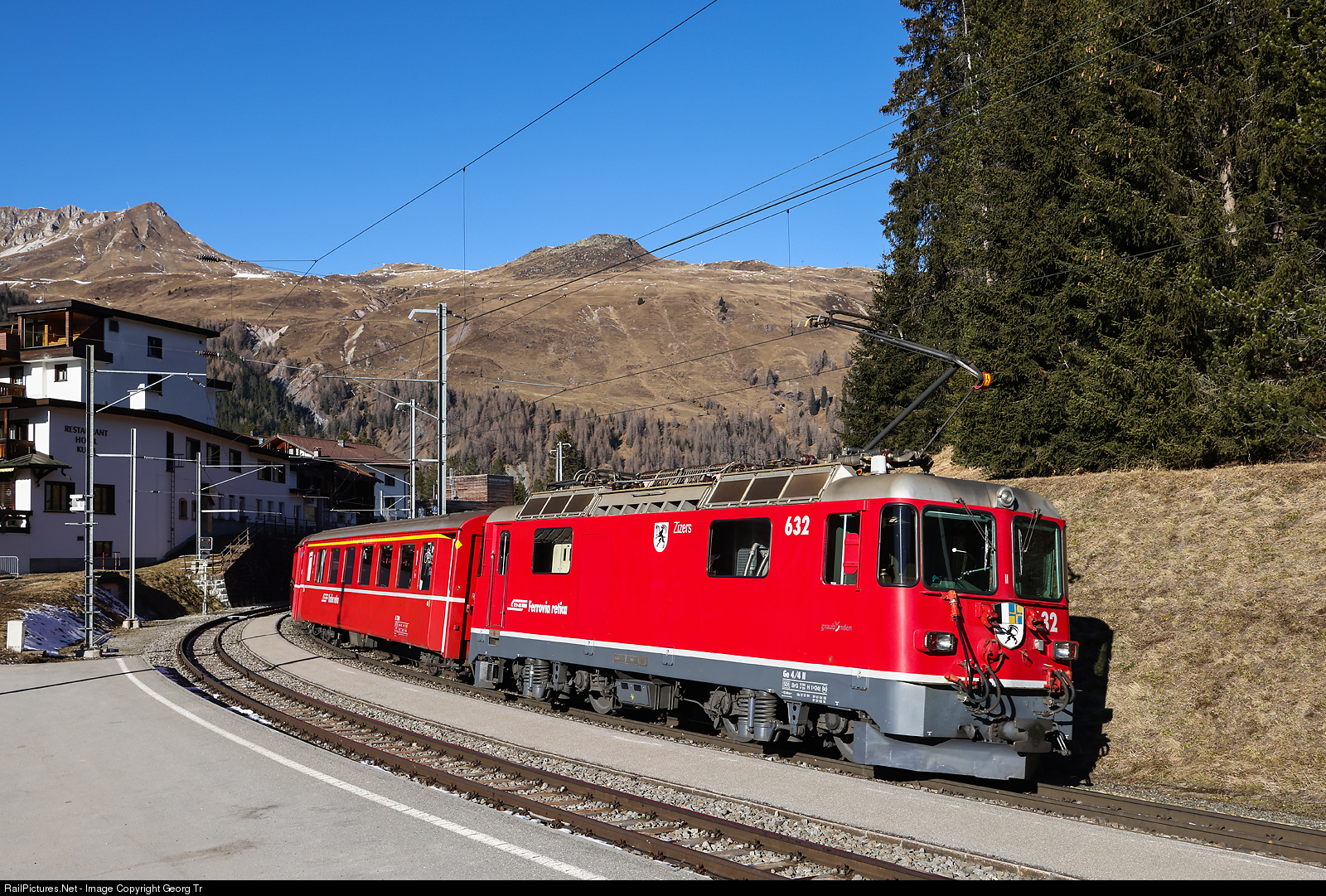 | Ge 4/4 II # 632 "Zizers" of the Rhaetian Railway is leaving Davos Wolfgang after a stop on request with the Regio Express 1040 from Davos Platz to Landquart. This is a push-pull train with standard cars of type I from the 1960' and a "NEVA" cab car BDt. |