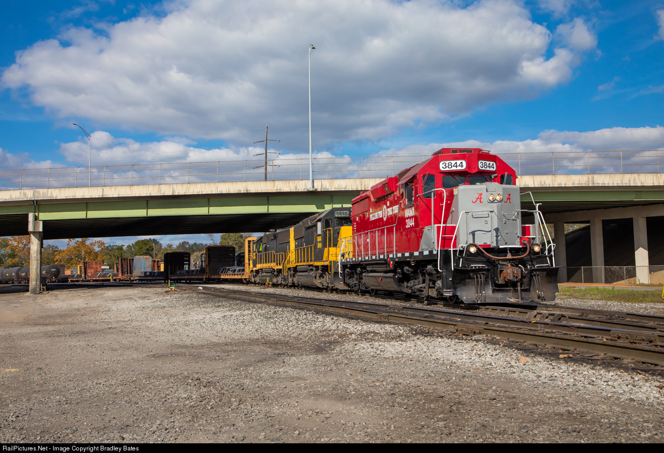| Alabama Southern Railroad Yard job 111 is seen here doing some work at their yard in Tuscaloosa, AL. The lead locomotive is one of two GP35's that the Alabama Southern had repainted back in 2011 into a special scheme honoring the Alabama Crimson Tide Football team and the University of Alabama, the 3844 has recently been rebuilt and repainted, the other GP35 #3851 is still wearing the same paint scheme it was put into back in 2011 |