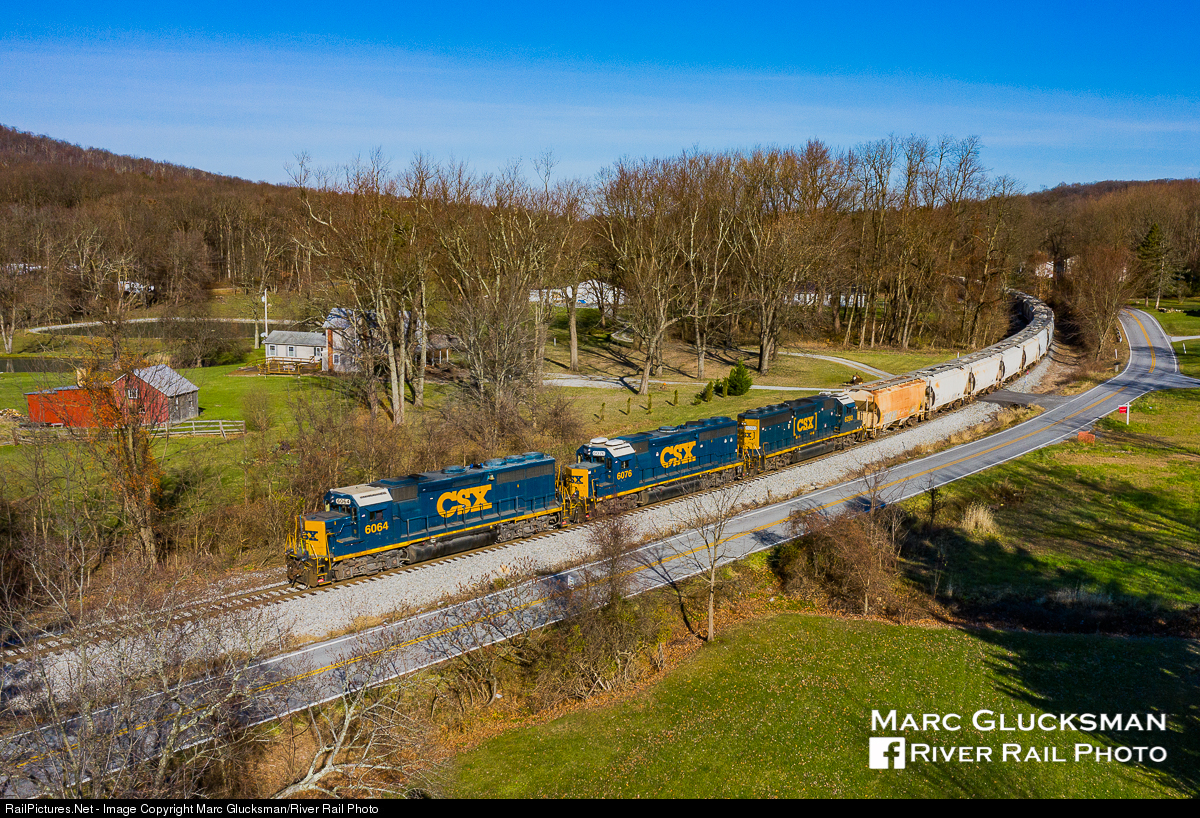 Three Geeps To Hagerstown. The trifecta of GP40-2s CSX 6064 (née-CO 4165) 6076 (née-CO 4177) and 6280 (née-CO 4382) were the power for train B702 on Tuesday, November 24, 2020. After a number of unusual moves due to a large volume of cars being interchanged between CSX and the Maryland Midland Railroad, the train departed Highfield-Cascade, Maryland in the afternoon for the return to Hagerstown, Maryland, seen here parallel to Cascade Road.
