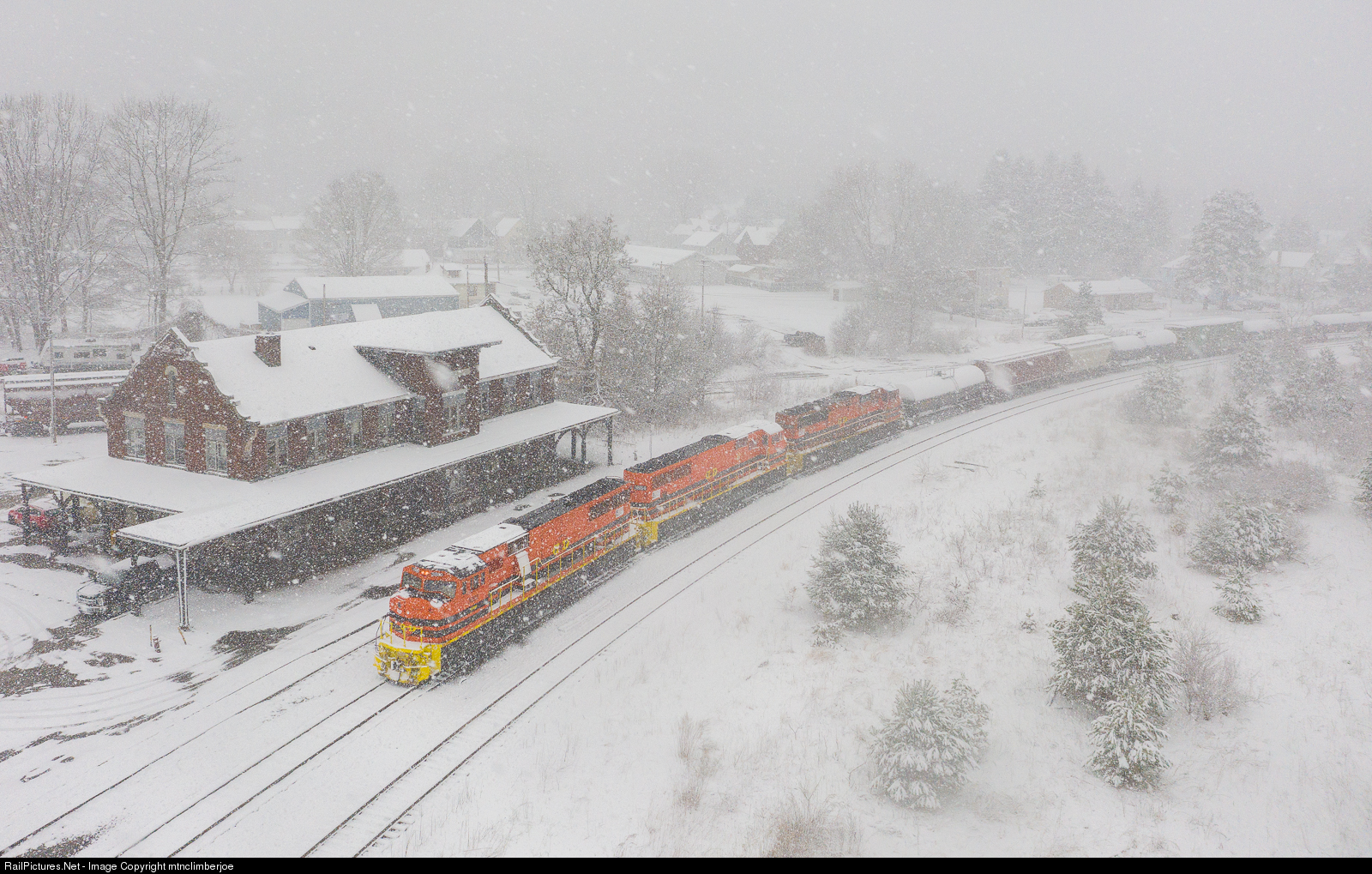 A heavy snow squall blankets Salamanca, New York as the Buffalo & Pittsburgh's SIRI gets ready to depart southbound behind a trio of SD60I's. The morning crew will board here at the former BR&P station.