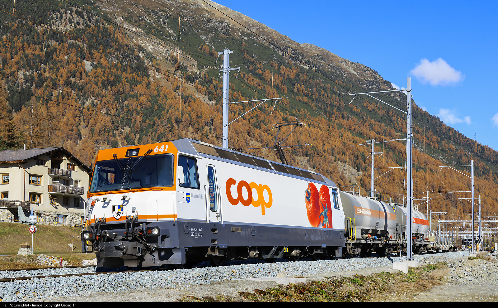 Ge 4/4 III # 641 "Maienfeld" in the publicity paint scheme for the Coop (large swiss retailer) is pulling the short freight 6139 from Preda to Samedan, leaving Bever. This is an unusual sight, this train is the work of the Ge 4/4 I series usually.