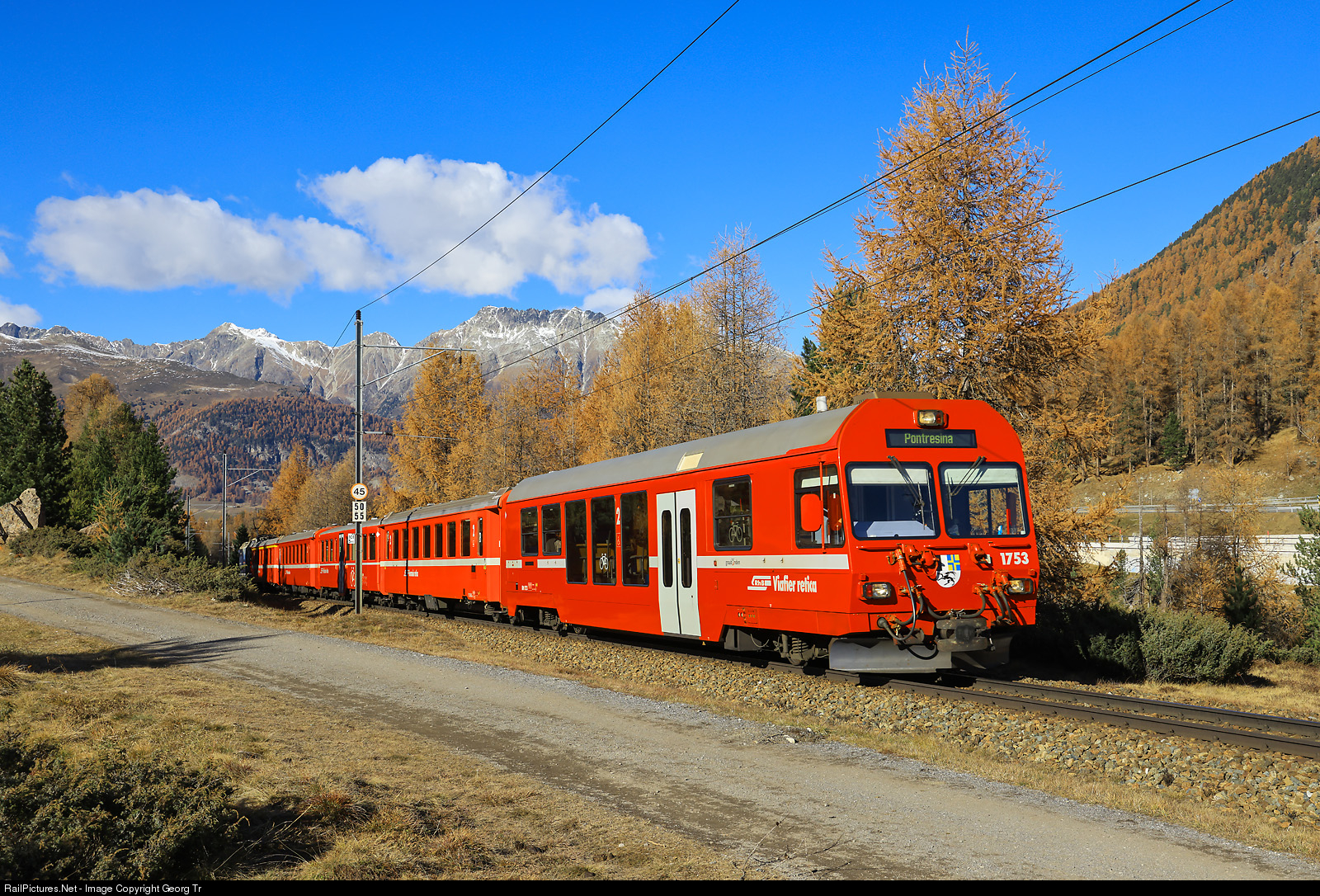 | Regional train 1937 from Scuol-Tarasp to Pontresina, with leading NEVA cab car BDt # 1753 and locomotive Ge 4/4 II # 627 in the rear is running between Punt Muragl and Pontresina. |
