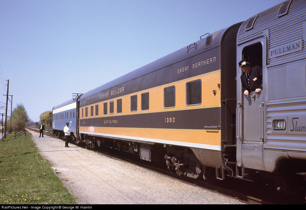 | More than one transition in this shot: GN orange & green to Big Sky blue; train is now operated by Amtrak, on MILW from the Twin Cities to Chicago |