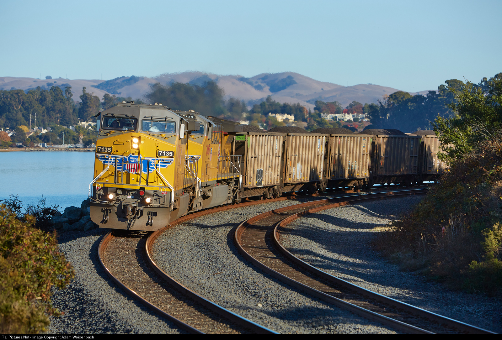 | Union Pacific 7135 leads coal loads west bound along the bay through the curve at Wilson Point at 2:41pm. Her final destination at Richmond, California is only a few miles away. |