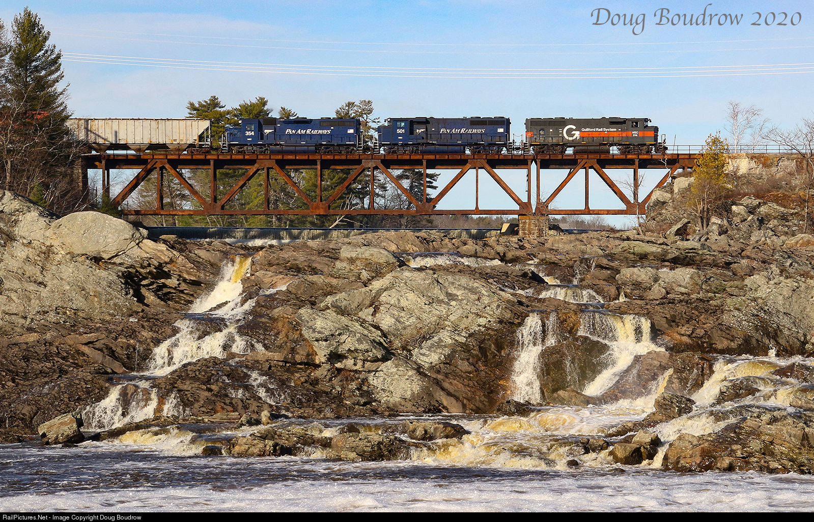 Pan Am freight PORU (Portland to Rumford) is seen crossing the old Maine Central Bridge across the Great Falls of the Androscoggin River. The train is crossing from Auburn into Lewiston.