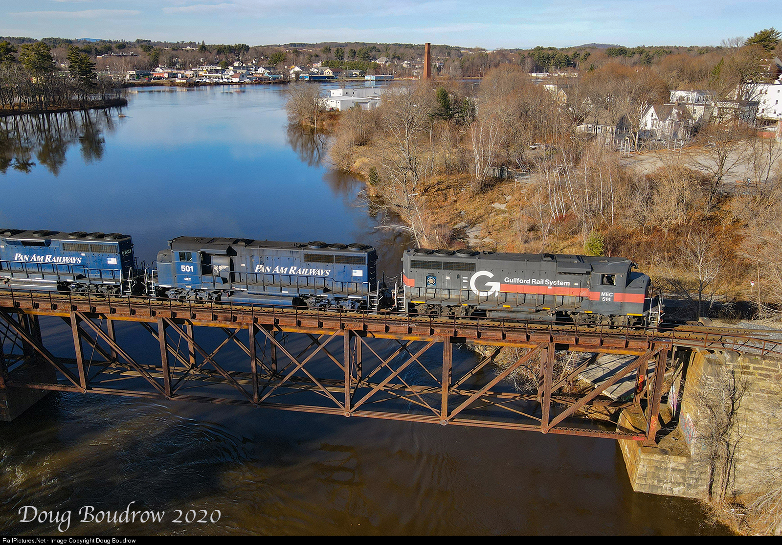 Pan Am freight PORU (Portland to Rumford) is seen crossing the old Maine Central Bridge across the Great Falls of the Androscoggin River. The train is crossing from Auburn into Lewiston.