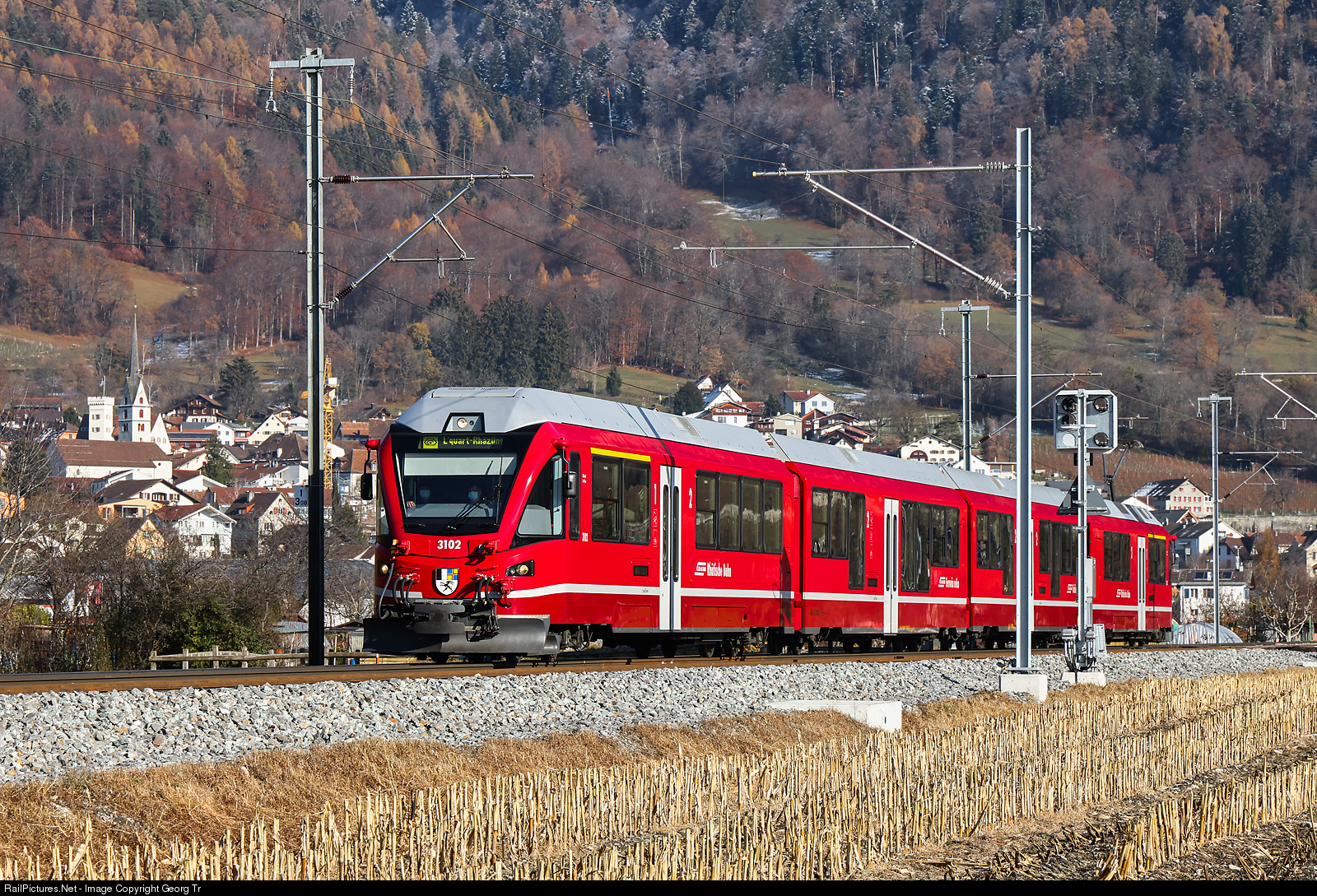 | "STZ" (Stammnetz Triebzug/trainset of the main network) ABe 4/16 # 3102 is running the S 1 service of the "S-Bahn Chur" 1519 from Schiers via Landquart-Chur to Rhäzüns, between Malans and Landquart. |