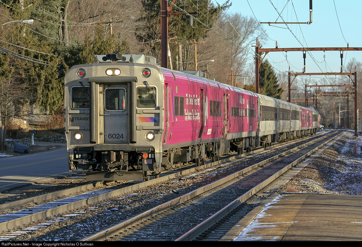 | Pink Machine: On a frigid December morning, NJT 6624 is on the approach of Mount Tabor Train Station for a station stop featuring several of its cars shrink-wrapped with pink advertisements. NJT 4614 (ALP46) is on the rear. |