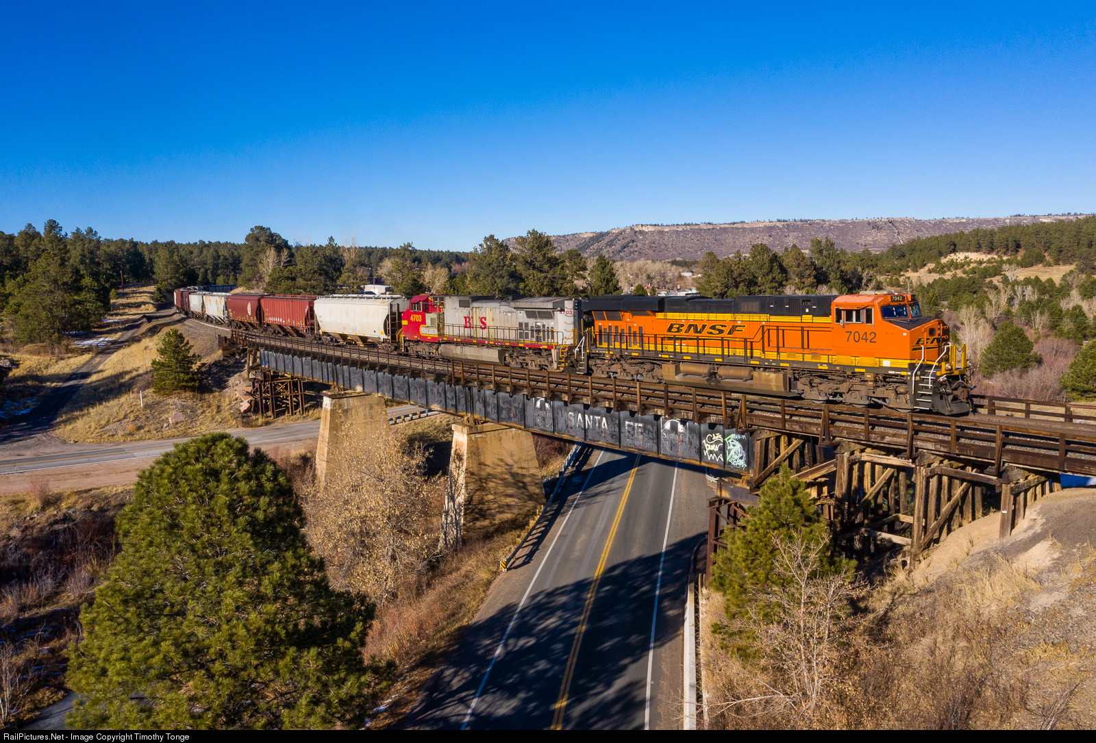 | BNSF 7043 along with ex Santa Fe Red/Silver BNSF 4703 lead a southbound grain train over the old Santa Fe Bridge at Larkspur, CO, Dec 4, 2020. |