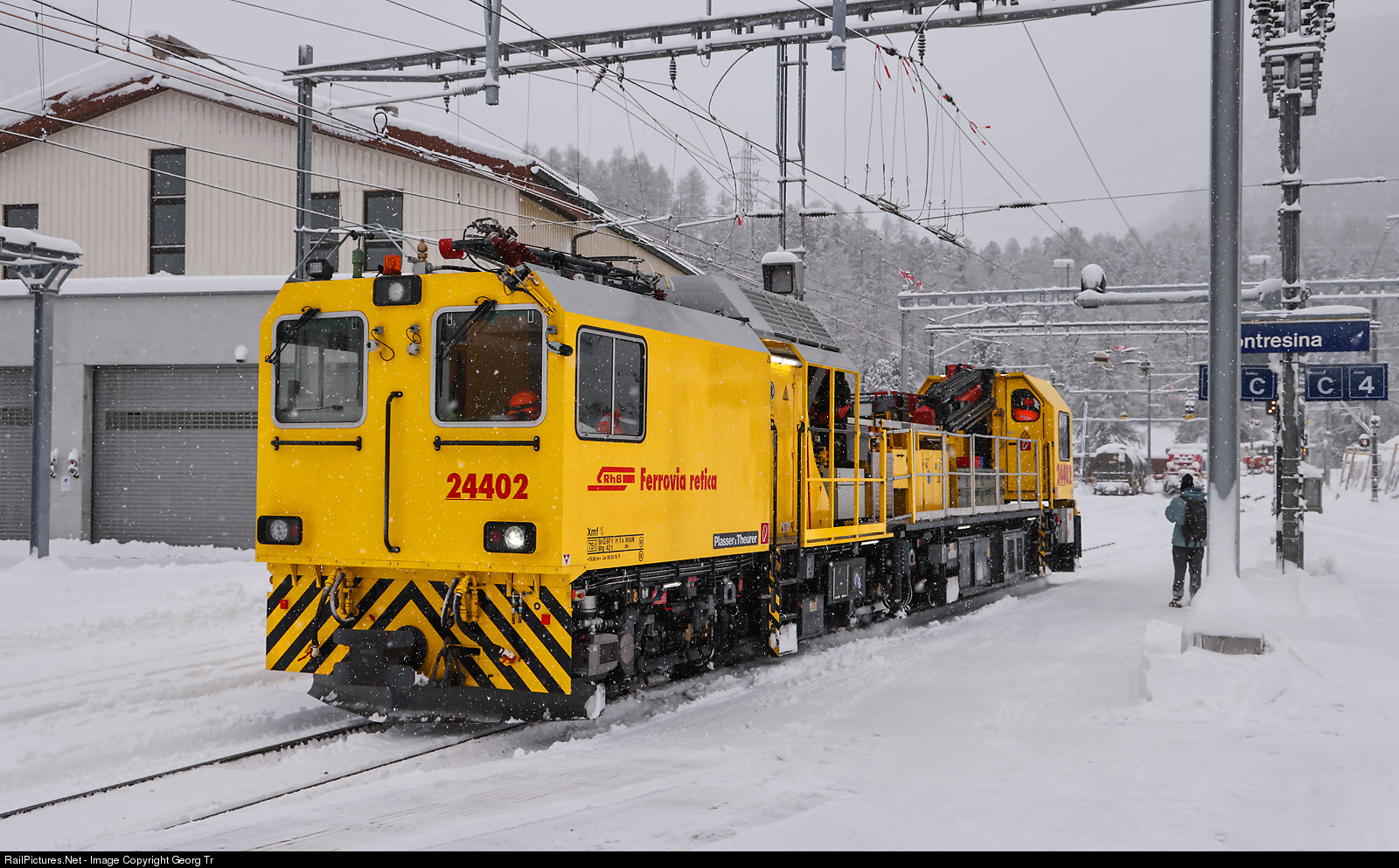 | During the night before, there were about 30 inches of snow on the Bernina pass. The overhead wire was iced and the trains couldn't run anymore. The diesel powered overhead wire maintenance and repair vehicle Xmf 6/6 # 24402 is leaving Pontresina to solve the problems. |