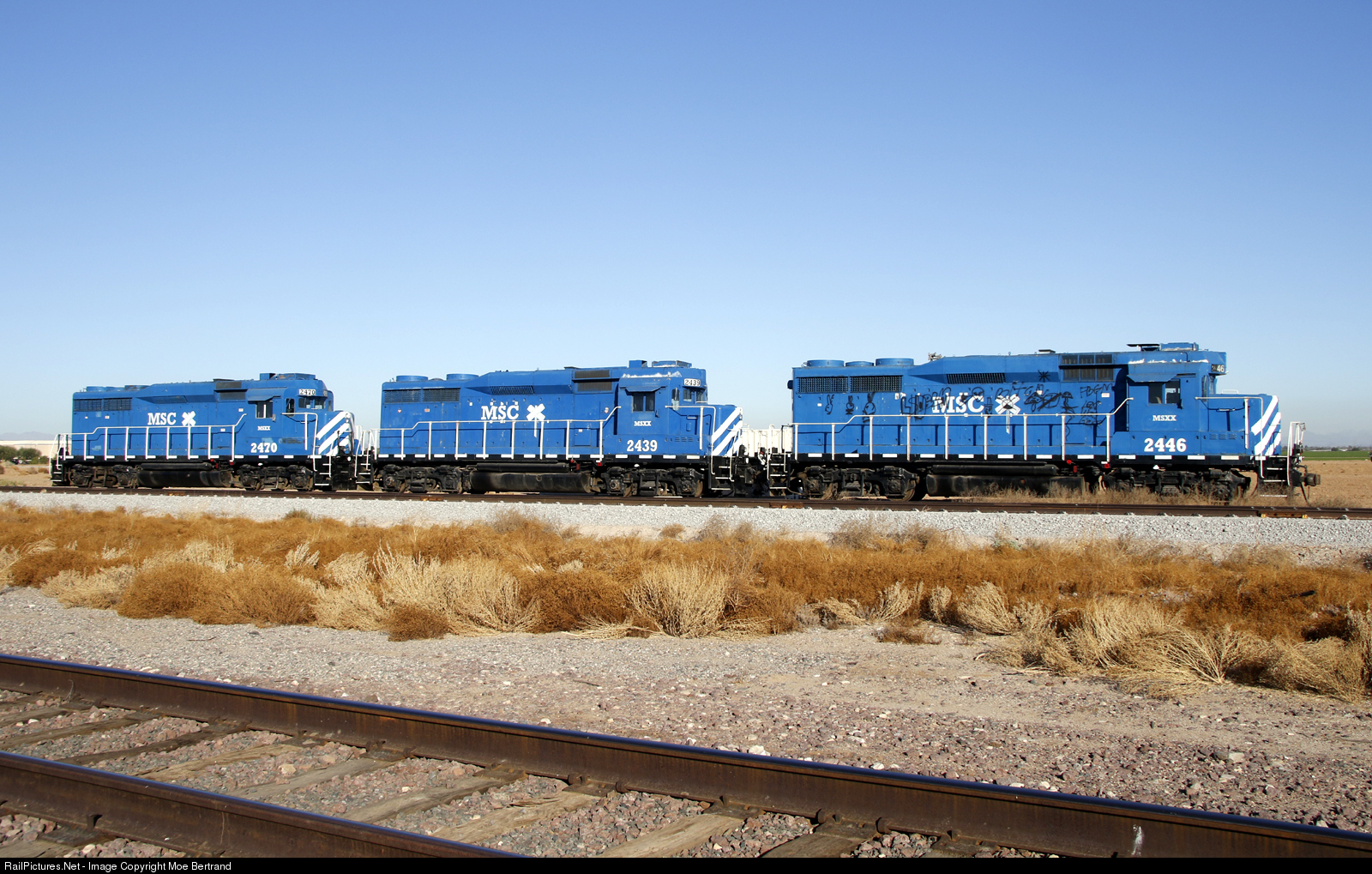 The former Coos Bay Rail Link GP30s currently "stored" on the new industrial spur off the Ennis Sub in El Mirage have recently been re-lettered to MSC with MSXX reporting marks.