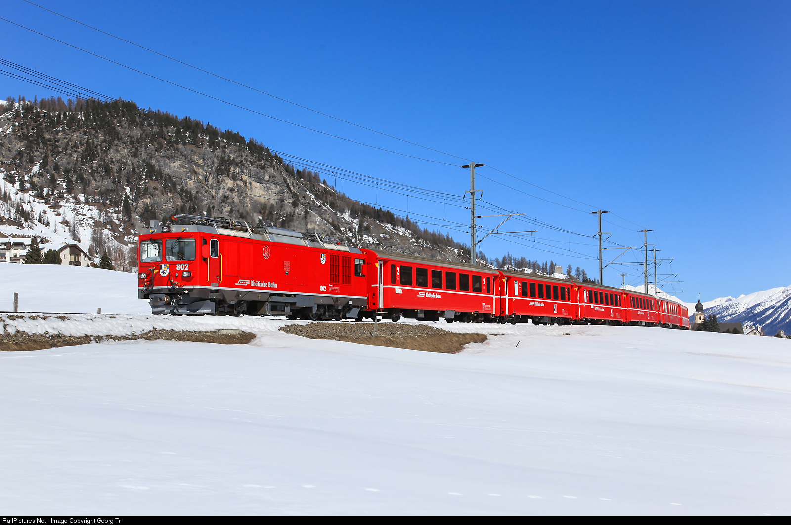 | Unusual service of the dual power electro/diesel locomotive Gem 4/4 # 802 "Marmotte" in diesel mode on the main network of the Rhaetian Railway. On this day the Engadin Ski Marathon took place (The Engadin Skimarathon is a cross country skiing event over the marathon distance of 42 km from Maloja to S-chanf), which always generates a lot of traffic on the Rhaetian Railway. For example, all runners have to be transported back from the finish line near S-chanf in the St. Moritz/Maloja area after the race. Of course there are also many spectators and supporters on the way. But unfortunately there was a catenary failure in the morning in the S-chanf area and for some time no trains were running at all. So the diesel locomotive # 802 pulled a stuck train back towards the Upper Engadine. Behind the locomotive, 4 short 2nd class standard coaches of type I can be seen, followed by a driving trailer BDt of a shuttle train with the Ge 4/4 I # 610 "Viamala" at the end of the train. |