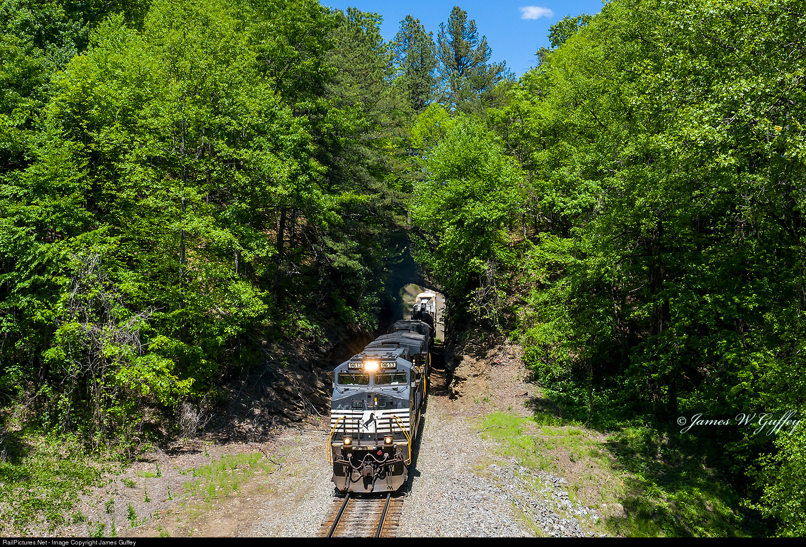 | NS P87 returns west to Asheville with excess tonnage from the prior day's 135 for the last time, as the last 135 on the Linwood-Asheville routing would run the next day. Here, they charge up the loops at Jarretts Tunnel. |