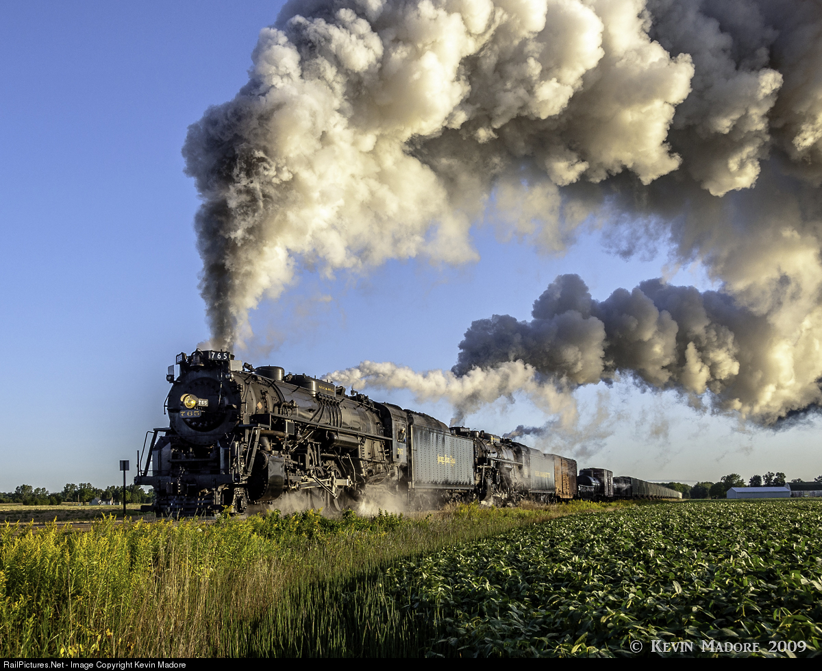 800 tons of Berkshire muscle. Shortly after dawn, Nickel Plate Road #765 and Pere Marquette #1225 charge across the lush farmland of Henderson, Michigan with a 31-car freight consist during an August, 2009 Lerro Productions photo event. The serendipitous presence of the only two operable Lima Berkshire Locomotives at the Steam Railroading Institute in Owosso, MI, along with the help of a cooperative host railroad, enabled what has to be one of the most impressive photo freights in recent memory, and one that would be very difficult (not to mention expensive) to ever re-create. This photo was taken along the Great Lakes Central Railroad, on private farm land off Chipman Road, in the town of Henderson, Michigan, with the kind permission of the land owner. Mother nature cooperated this day, and the crews from the Ft. Wayne Railroad Historical Society and the Steam Railroading Institute put on a great show for the assembled photographers.