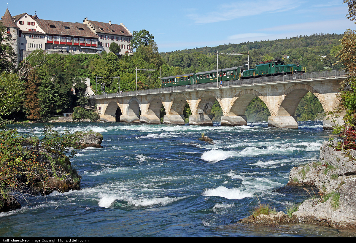 | "Crocodile" Be 6/8 III 13302 is maintained by "Betriebsgruppe 13302" www.13302.ch . The train is crossing the bridge above the Rhine Falls. |