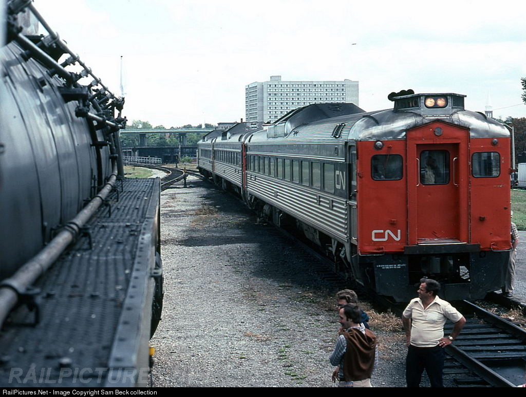 | As seen from inside the cab of CN 6060, a 4-8-2 steam locomotive, a three-unit RDC consist passes by for a station stop. Tom Golden photo. |