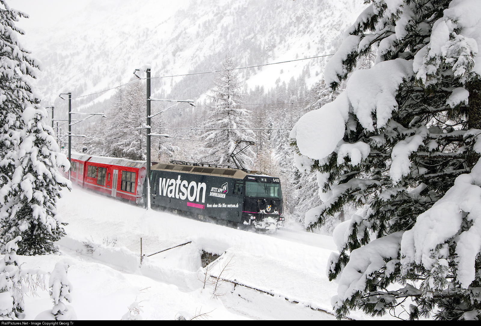 Ge 4/4 III # 648 of the Rhaetian Railway, in the publicity paint scheme for the "watson" news portal, is shoving the ALVRA push-pull train of the Interregio 1144 from St.Moritz to Chur through the snowy Bever valley towards the Albula tunnel.