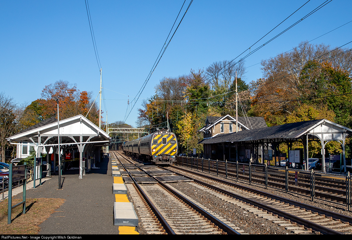 An Amtrak Keystone led by a former Metroliner turned cab car races east through Haverford, PA. The train is passing the 1870 PRR built station while en route to New York via Philadelphia.