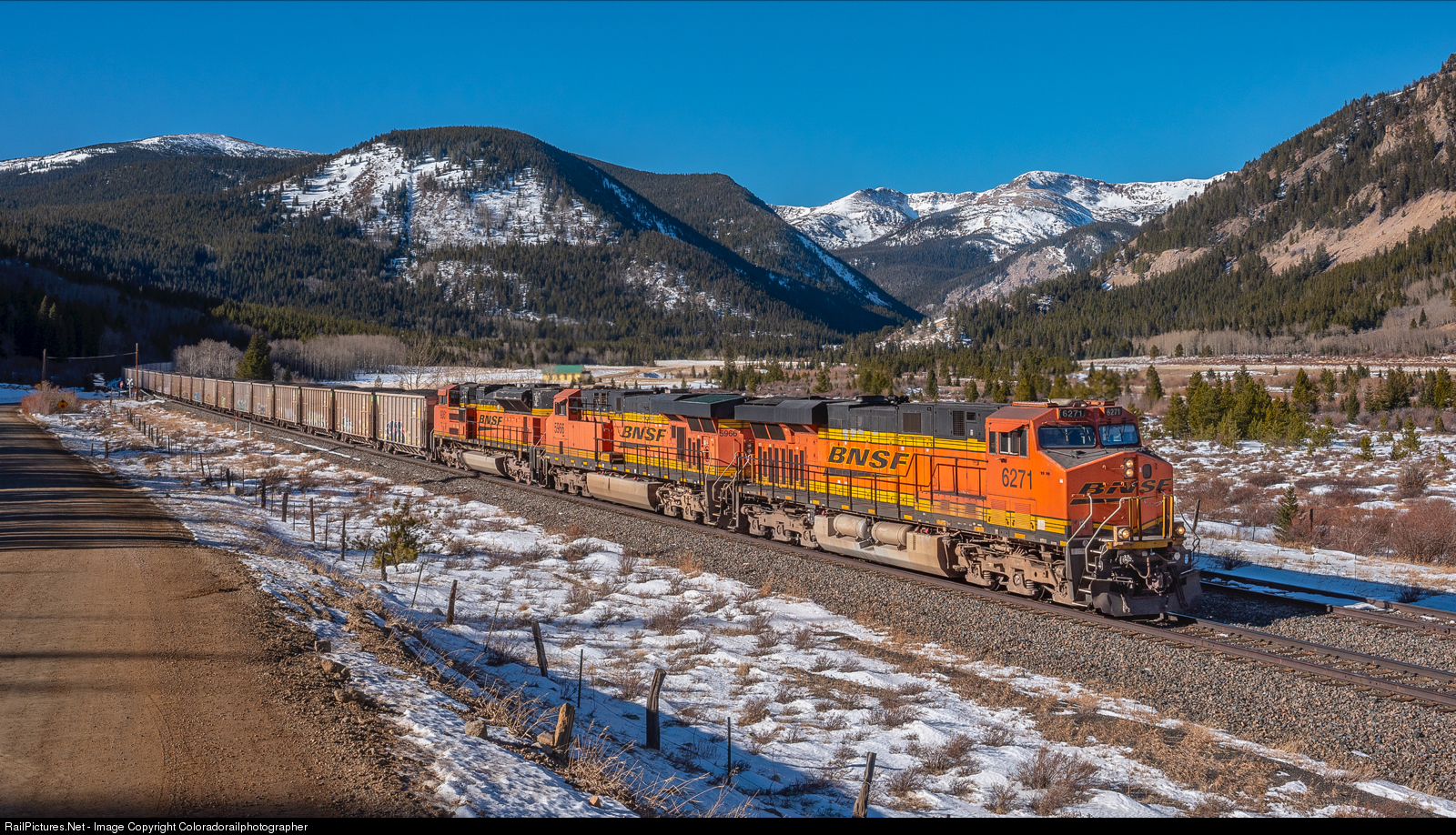 Wednesday December 9, 2020 the Union Pacific Moffat Subdivision played host to a unlikely traveler. BNSF 6271 leads a trio of power with 2 in DPU on the back reminiscent of the “6-pack” days when coal was a regular thing. The Continental Divide stands proud along East Portal Road near the venerable school house. A classic shot with pleasant winter mid morning light on an uncustomary warm still day near Moffat Tunnel.