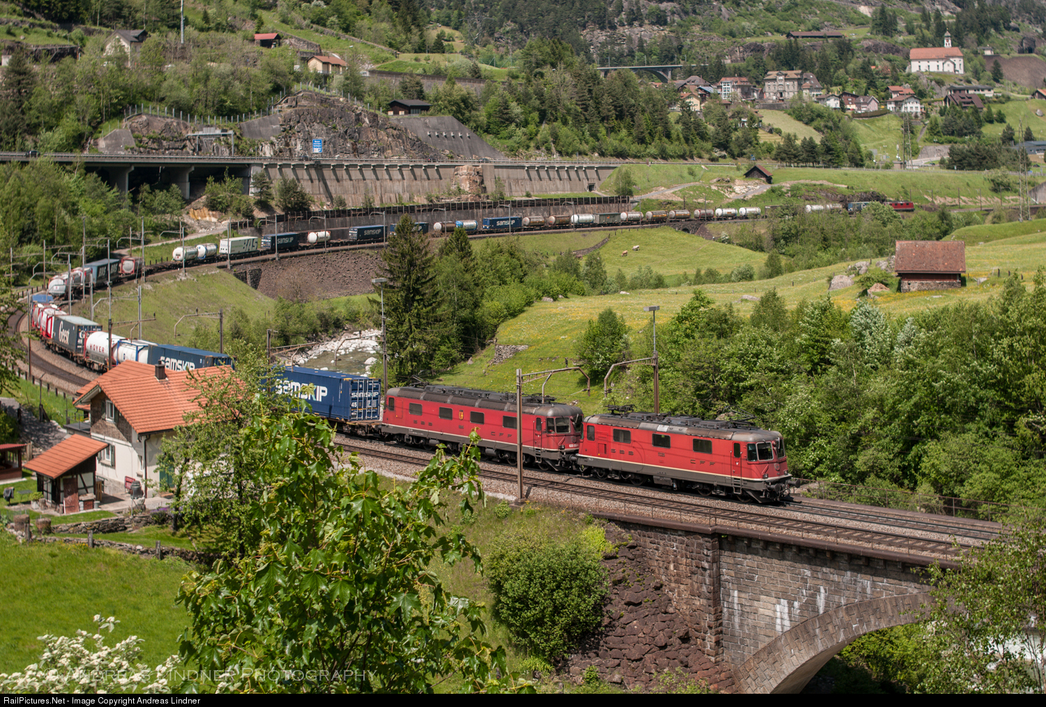 | Gone are the days when heavy freight trains drove over the Gotthard mountain route. Here it was Re 4/4 11326 and Re 6/6 11685 that were supported by Re 4/4 11163 at the end of the train. Today it's almost flat through the new base tunnel, which is over 35 miles long. |