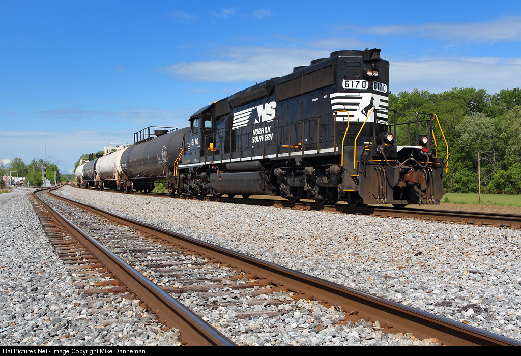 | Norfolk Southern EMD SD40-2 No. 6170 switches cars at industries at Whitehorn Road grade crossing near Bulls Gap, Tennessee, on May 10, 2014. |