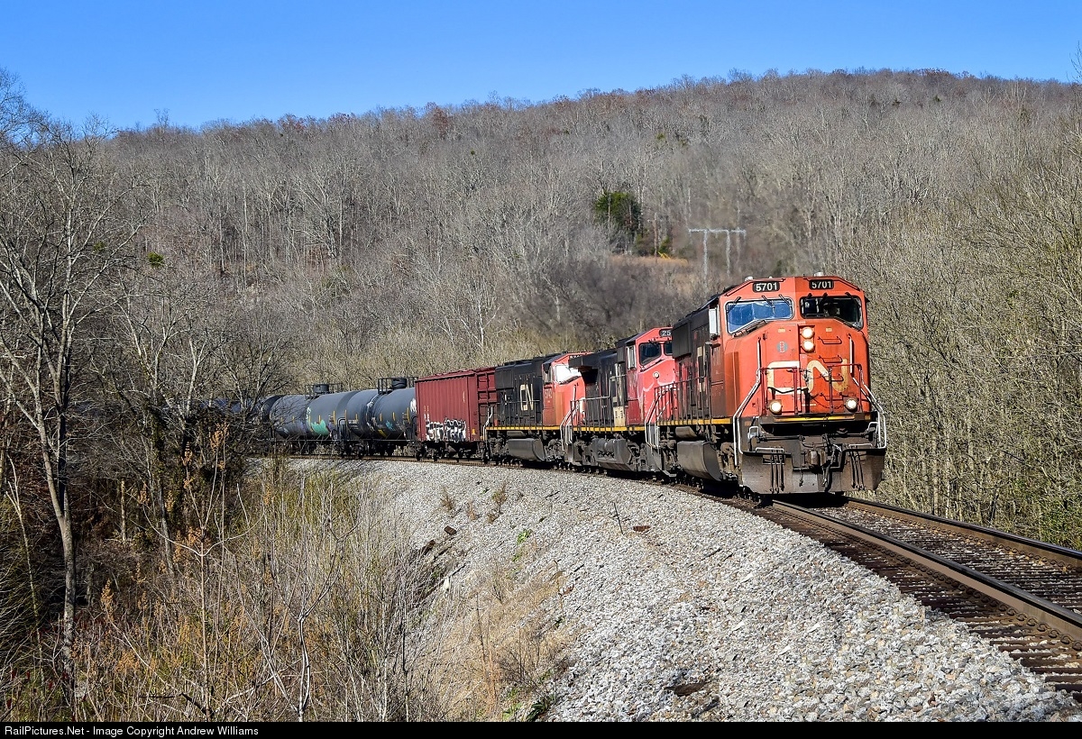 CSX K445-08 is seen winding around the curve through the Rush Creek Gorge in Tantallon just after the lunch hour today. No dynamics on this one, made it a super slow run down the mountain grade for this loaded ethanol load. The trio of Canadian National locomotives made a good contrast to the gray and dead looking vegetation in this years “stick season” as some call it. The CN 5701 and trailing companions will take the train south to Wauhatchie and eventually to Atlanta where the train will terminate at Lawrenceville, Georgia.