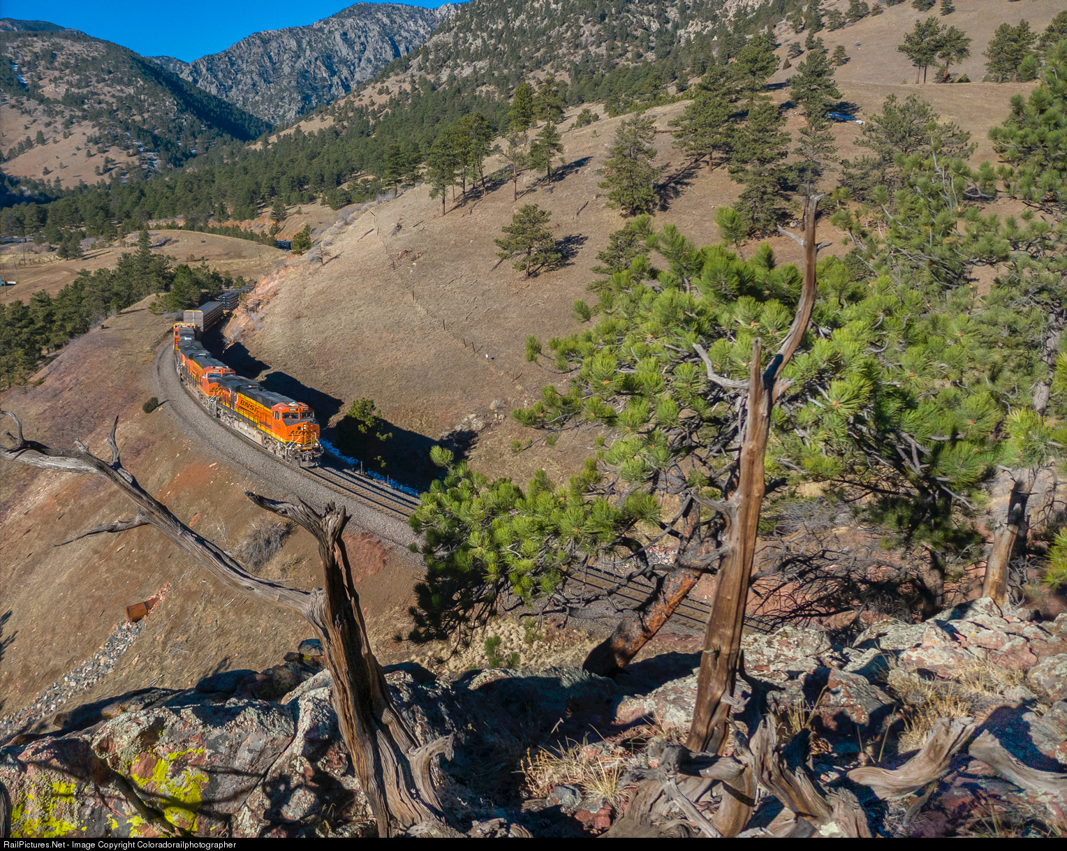 Westbound and about to enter the first bore of the Tunnel District BNSF’s HDENPVO manifest is moving some new pipe and a pleasant variety of business. The ancient high altitude botanics and knurled wood weave a story through this frame about the Moffat Road. The stories this tree could tell.
