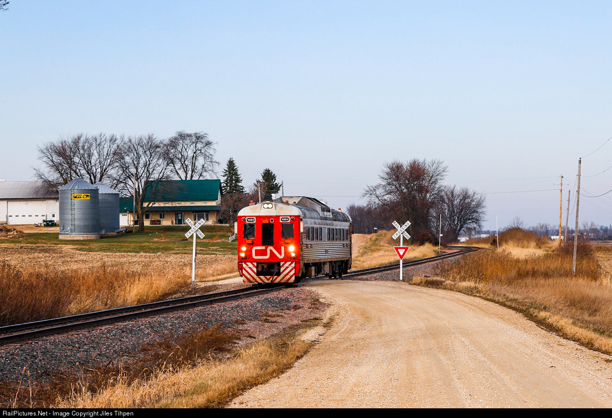 | CNs Track Geometry RDC heads down the Cedar Rapids Sub just south of Manchester Iowa. The trip down to Cedar Rapids is a deadhead move and when they get to CR the crew will flip ends and inspect the CR sub Northbound. Once back at Manchester they will head towards Waterloo where theyll tie down for the night. |