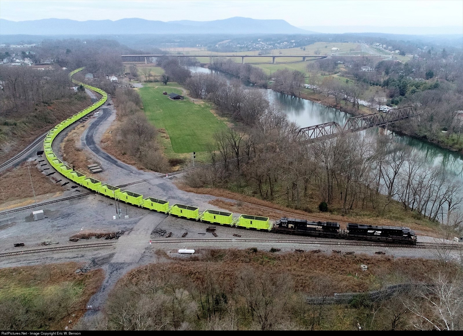 NS train 16T makes a quick eastbound move before continuing north across the bridge at Riverton Junction with a large cut of brand new Amtrak hoppers. #716