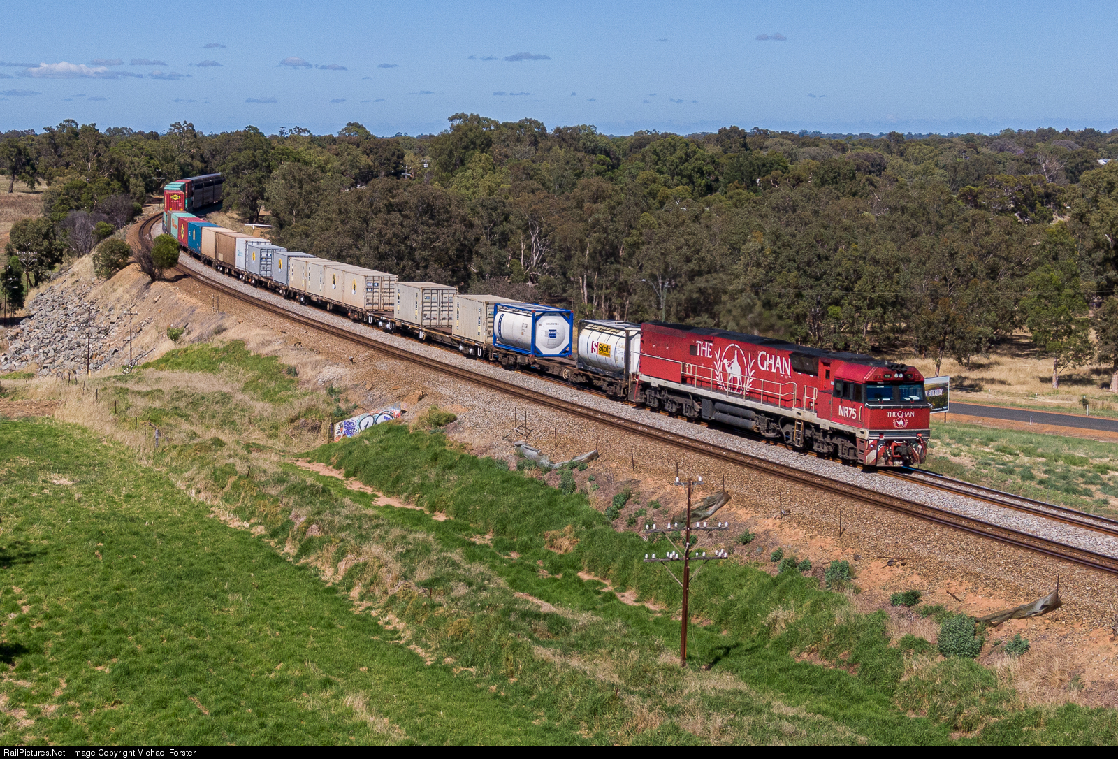 NR75 wearing "The Ghan" paint, is usually assigned to the passenger service from Adelaide to Darwin. From time to time however, Ghan locomotives can be allocated to Pacific National's freight pool, especially in 2020 due to Covid travel restrictions affecting interstate travel.