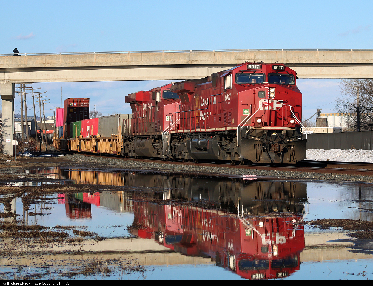CP 101 arrives in Thunder Bay and reflects nicely in a large puddle of spring runoff.