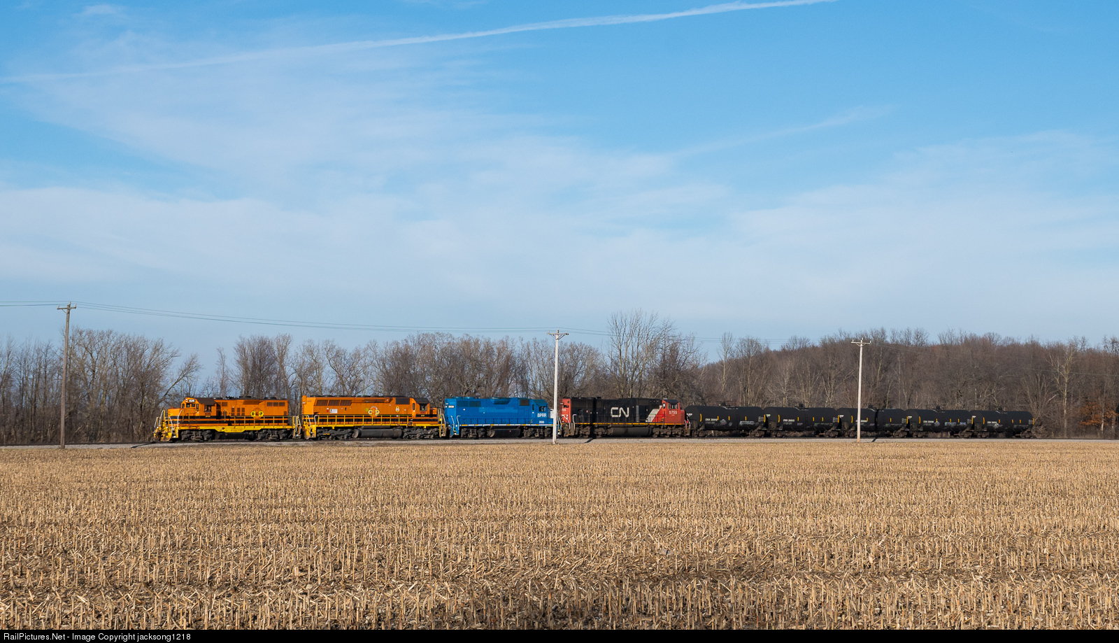 | Rochester and Southern train BL-1 passes through the open farm fields of Wheatland Center, NY with an interesting lashup that includes a CN SD75I bound for rebuild at AMP in Dansville, NY. |
