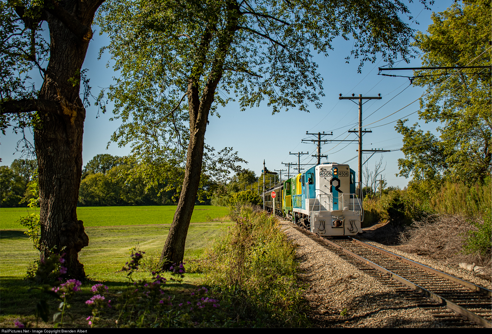 As the evening light begins to creep in, the IRMs Showcase Weekend is still in full swing. After a successful trip to Kishwaukee Grove, the shiny high hood geep pair, Rock Island #4506 and Illinois Terminal #1605, shoves a sizable Coach Train back towards the museum grounds for another round of passengers.