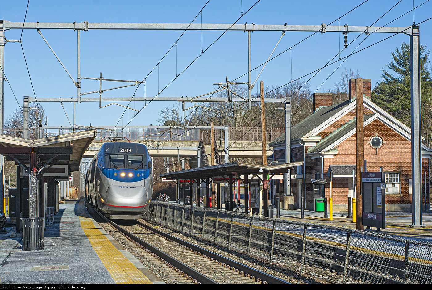 | A southbound Amtrak Acela Express is on the opening stretch of its trip down to Washington as it winds along the Northeast Corridor and past the shelters and station building at Sharon. The sun is out, but it doesn't make it feel very warm on this brisk December afternoon. |