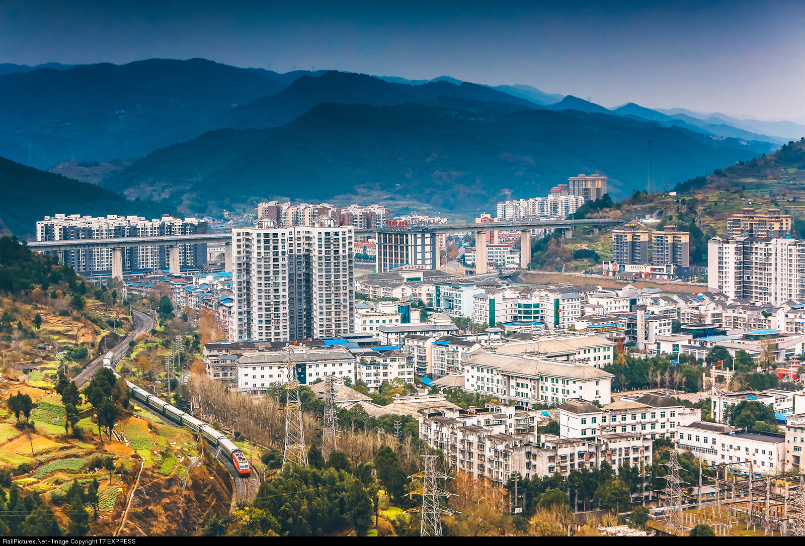 Southwestern China, as the town expanding in the valley, something new also appears. Despite a newly built high speed railway directly bridges hilltops above the town and it takes charges of the main passenger service though, the former rail which snakes along valley still works. Compared with high speed bullet trains, the figure line of ordinary trains is much more attractive as they roll by.
