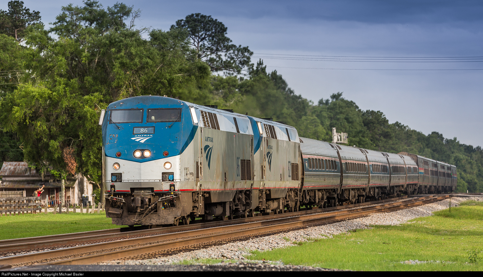 | Amtrak Train with the No. 86 "Silver Meteor" from Miami to New York passing through Folkston / GA. Pulled by Locomotive P42DC, also No. 86, on this wonderful late Spring Evening.