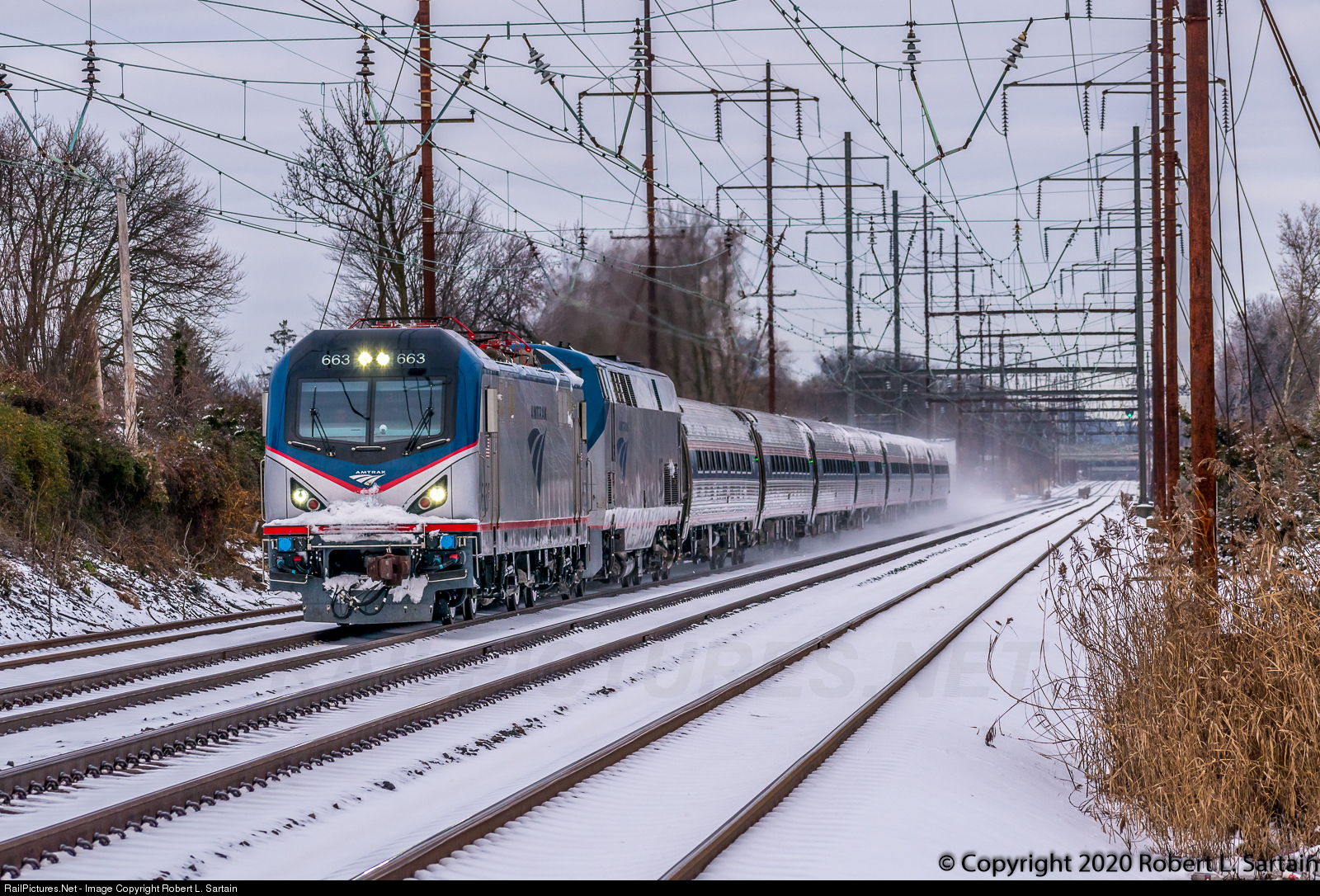 Look, Ma, no pans! With heavy snows around Boston from Winter Storm Gail, Amtrak Regionals that serve Boston ran with diesels. Amtrak Northeast Regional 171 is such an example. Even though Philadelphia-area snow accumulations weren't severe, ACS-64 663 is running with pans down as P42DC 95 provides the muscle, running south of Philadelphia towards Washington at milepost 9.0.