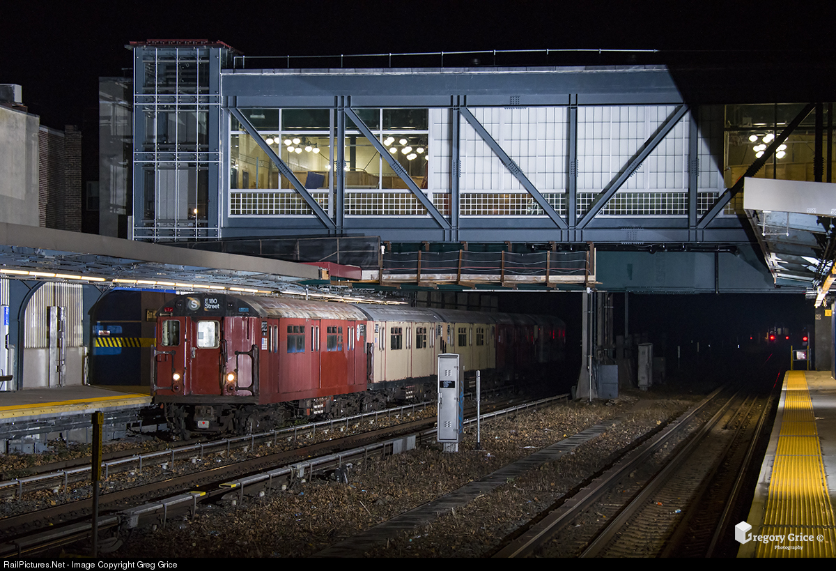 "Gel Train Under Gun Hill Rd" New York City Transit's "Rail Adhesion Train", led by St. Louis Car Company R33 #9323, passes under the newly built Gun Hill Road station house on the IRT Dyre Avenue Line. Gun Hill Road station is the first station on the line to be extensively rebuilt to meet ADA standards. Unfortunately this process involved getting rid of the original New York, Westchester & Boston structure that was similar to the design found at Morris Park. Rail Adhesion Trains, also known as "Gel Trains", make one nightly round trip on select portions of specific New York City Transit subway lines applying a sandite solution to the rails to eliminate slip slide conditions during the leaf season. These trains usually consist of old subway cars that have been retired from revenue service and converted to work train duties. The Dyre Ave Gel Train is the A Division's only Rail Adhesion train; consisting of R33 "Redbird" cars and running on the original New York, Westchester & Boston Railroad right of way between East 180th Street and Dyre Avenue.