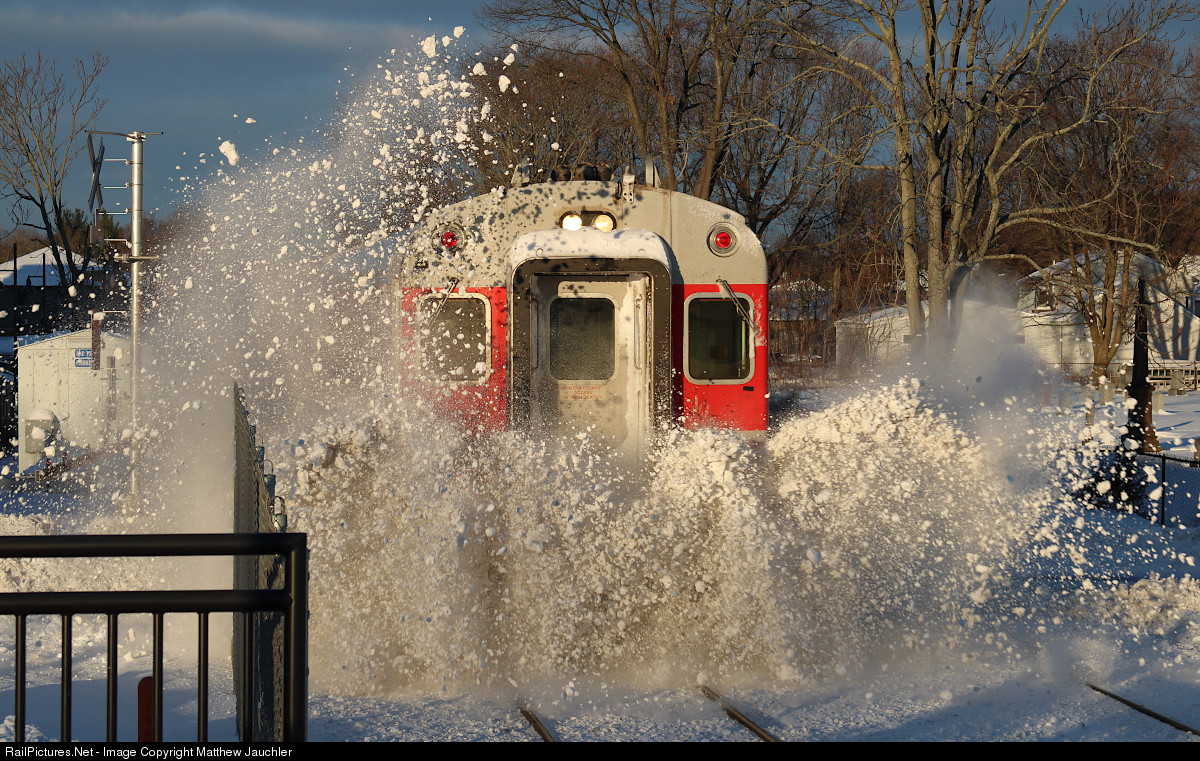 | A southbound CTrail cab car kicks up an impressive cloud of snow on approach to the Wallingford station. The snowfall caused a number of delays and cancellations, particularly for Amtrak. |