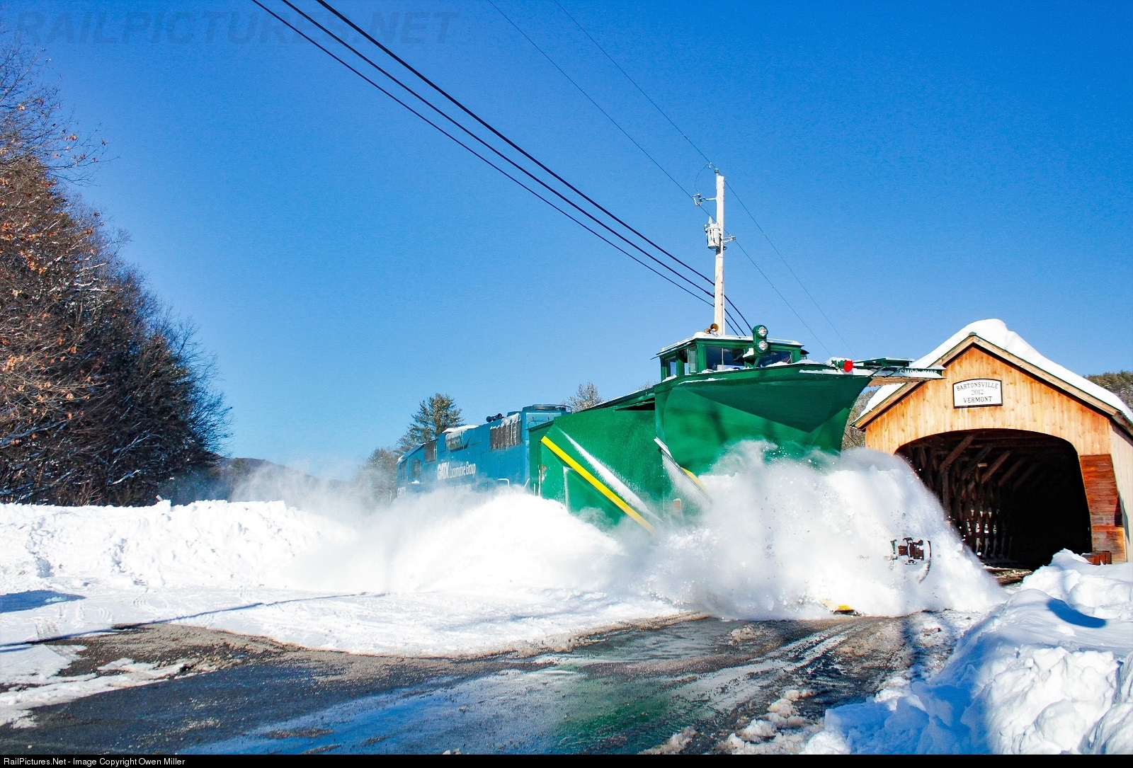 An eastbound Plow Extra is seen busting through a snow drift at the Bartonsville bridge on 12/18/2020. The plow would go to Walpole to be spun on the turntable before heading back to Rutland