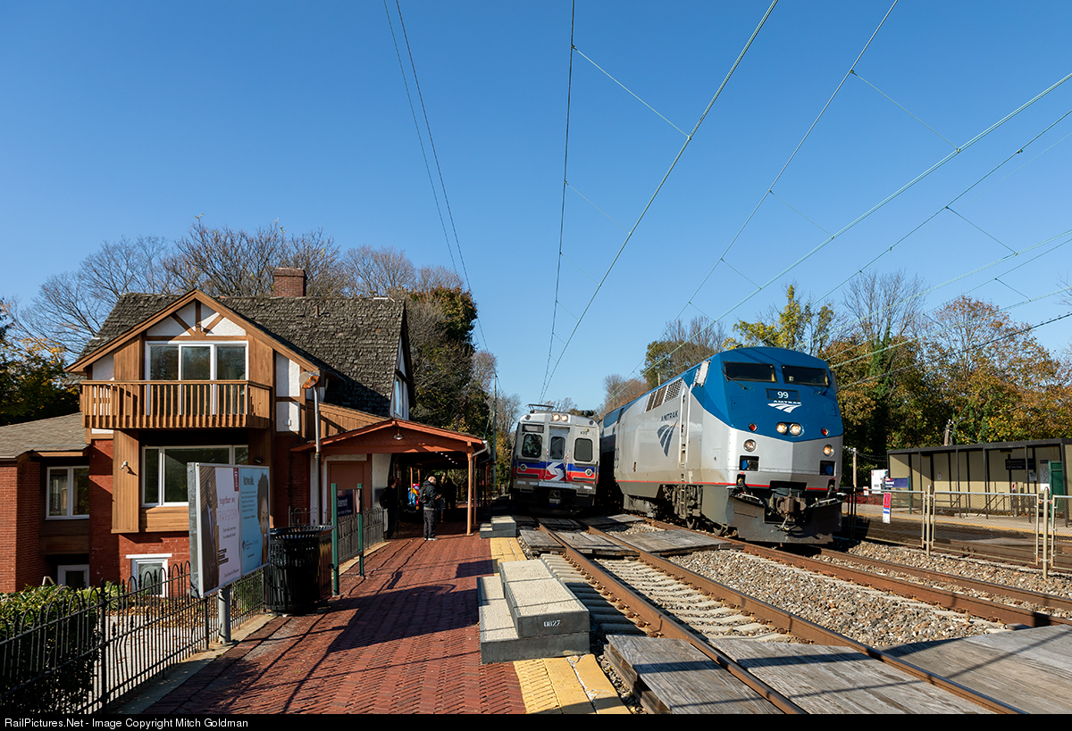 Amtrak's "Pennsylvanian" - a Pittsburgh, PA to New York City train, meets and overtakes a SEPTA "Paoli /Thorndale" commuter train at Rosement, PA along the former PRR main, now operated by Amtrak. Rosemont station sits to the left, built in 1892, by the Pennsylvania Rail Road.
