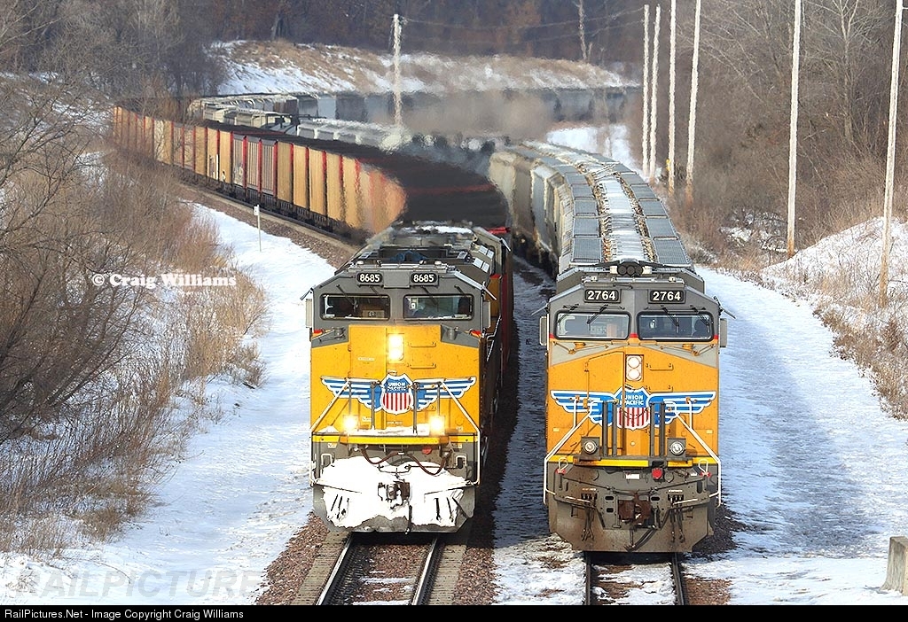 A westbound Bayport, MN, for Northern States Power to Black thunder Mine, Wy, empty coal train rumbles west fresh off a crew change at Boone. The train passes the DP unit on an eastbound MNPSSX-05 parked on the south track that's been there all afternoon.