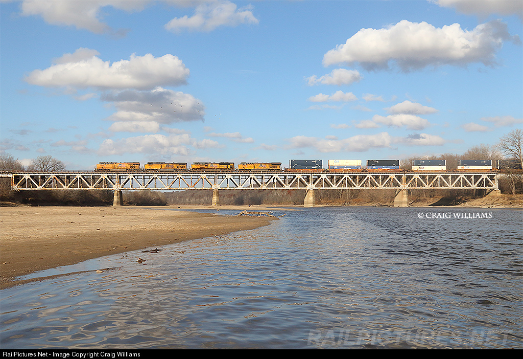 | Been to the Des Moines River Bridge a few times on the Marceline Sub. I was surprised how low the water was this trip! We were able to wonder out into the middle of the river, which meant the boys played in the water and I ducked clouds between trains as we enjoyed this unusual 70 degree November day. Here a Global 4 Z-train rumbles across the bridge on its trek towards KC and the next crew change. The train is passing from Iowa into Missouri as it crosses the bridge. |